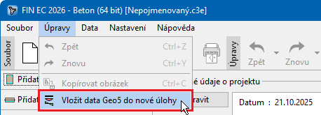 Do programů "Fin EC" lze načíst data z programů "Geo5" pomocí příkazu "Vložit data Geo5 do nové úlohy", který je umístěn v hlavním menu v části "Úpravy".