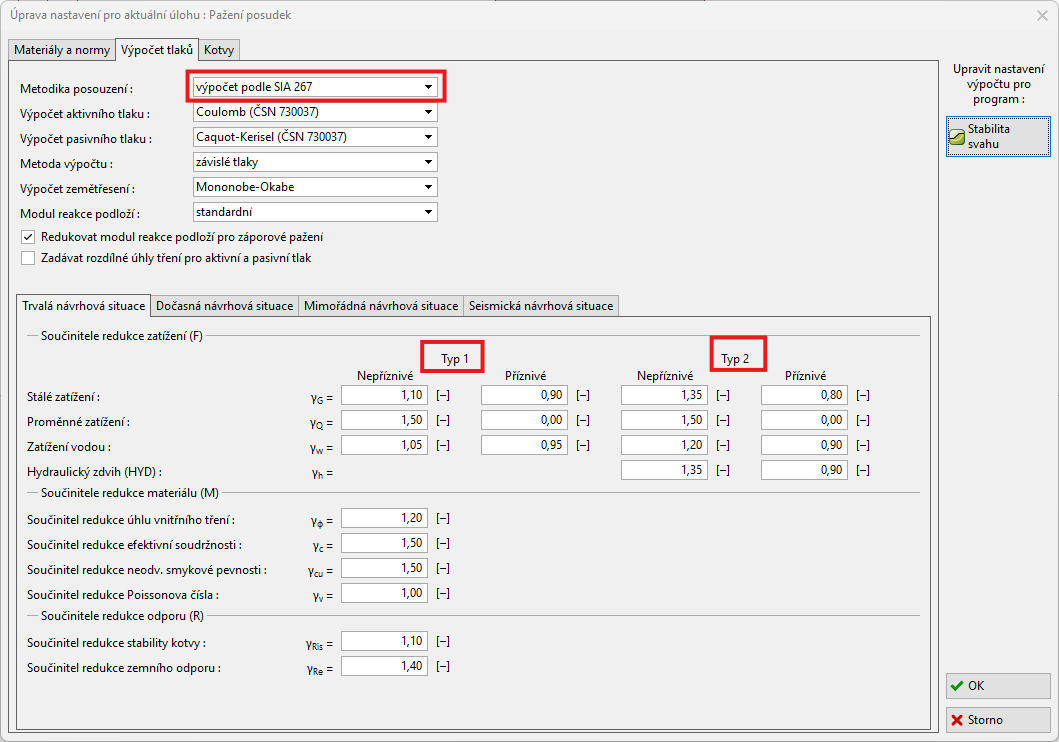 • Výpočet pažících konstrukcí (pažení návrh, pažení posudek, zemní tlaky) - uživatel si volí, zda chce provést výpočet pro součinitele Typu 1 nebo Typu 2