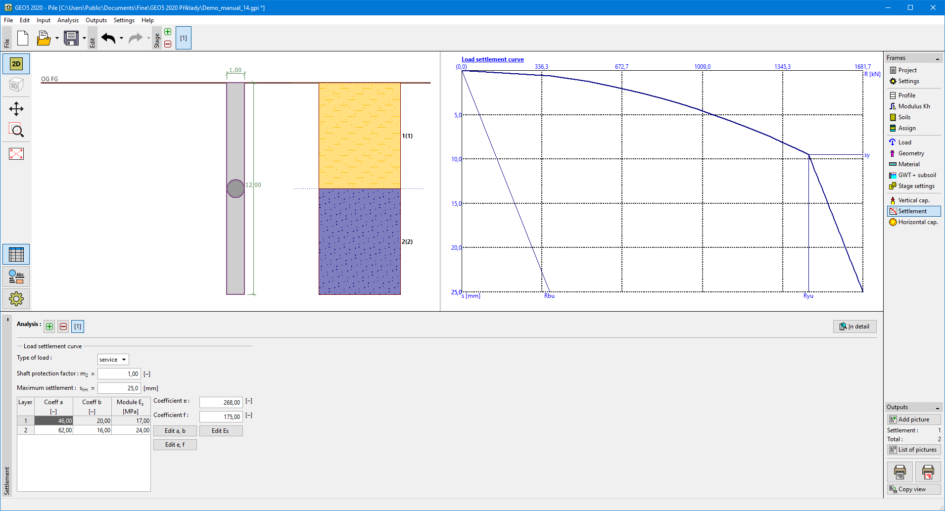 The "Settlement" frame serves to display the pile load-settlement curve. More analyses can be performed in the frame.