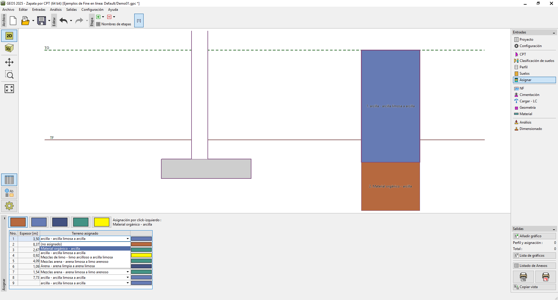 El cuadro "Asignar" no está disponible, en el caso del análisis según el método de Meyerhof (CPT o SPT).